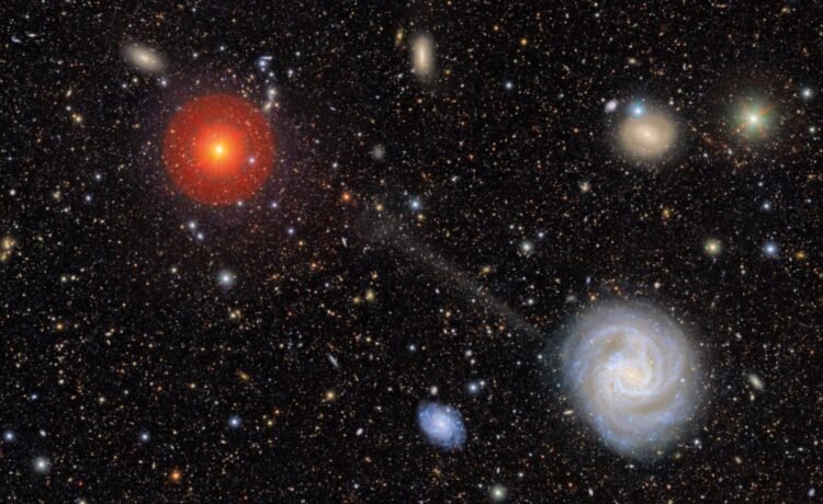 This image, from the Vera Rubin Observatory’s “First Look” release, shows prominent galaxy Messier 61, at lower-right, and an impressive stellar stream emanating from it towards the upper-left. This marks the first identification of a novel stellar stream in Rubin data, and may be the ultimate culprit behind the galactic interaction that triggered a recent starburst event inside the main galaxy itself. (Credit: RubinObs/NOIRLab/SLAC/NSF/DOE/AURA)