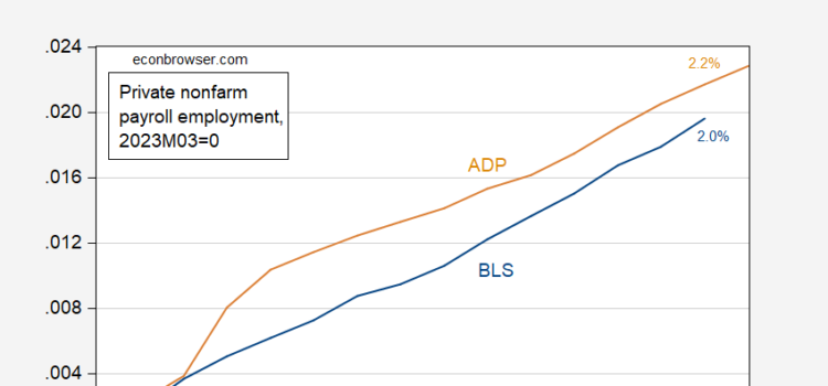 Then instead of 135224 thousand private employment in April, it would be 135509 thousand. Figure 1: Private nonfarm payroll employment from BLS (blue), and from ADP (tan), in logs 2023M03=0. Source: BLS, ADP via FRED, and author’s calculations. ...