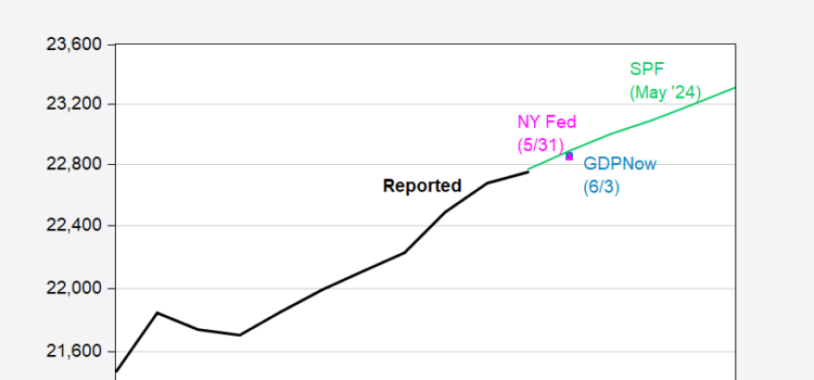 Atlanta and NY Fed lower growth rates for Q2 Figure 1: GDP as reported (bold black), GDPNow (light blue square) , NY Fed (pink triangle), Survey of Professional Forecasters May median (light green line), all in bn.Ch.2017$, SAAR. Source: BEA...