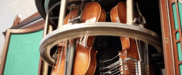 Three men wearing dark coats and hats, one of whom is much taller, stand outside a simple tent.