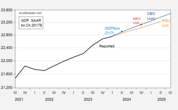 WSJ July forecast relative to CBO, IMF WEO update, and GDPNow as of yesterday: Figure 1: GDP as reported (bold...
