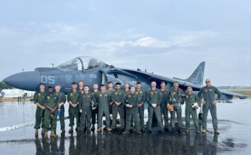 A retired AV-8B Harrier II+ and VMA-223 squadron members (pictured) get ready for the aircraft’s induction into the Hickory Air...