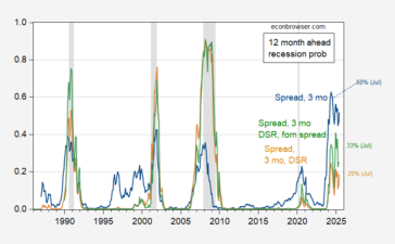 Probabilities have peaked, using a standard spread model. Here is an updated assessment of recession probabilities (for 12 months ahead),...