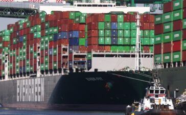 Cargo containers sit stacked on ships at the Port of Los Angeles, the nation’s busiest container port, in San Pedro,...