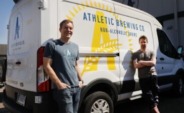 Company founder Bill Shufelt (left) and head brewer John Walker pause at the Athletic Brewing’s non-alcoholic brewery and production plant...