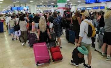 People wait at Cancun International Airport, after Hurricane Beryl made landfall as a category 2 storm, in Cancun, Mexico, July...