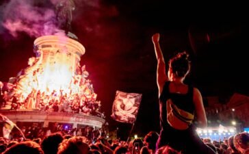 Demonstrators take part in a rally against the far right following the announcement of the results of the first round...