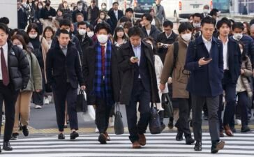 People commuting to work in the morning cross a pedestrian crossing in Tokyo on February 15, 2024. Kazuhiro Nogi | AFP...
