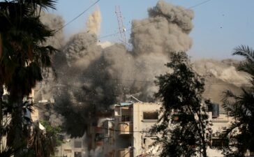 Dust and black smoke rises moments after an Israeli air strike targeted a residential building in the city of Bureij...