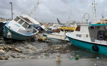 Damaged fishing boats rest on the shore after the passing of Hurricane Beryl at the Bridgetown Fish Market, Bridgetown, Barbados...