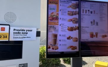 The drive-thru menu at a McDonald's restaurant showing various meal options and promotions, in Buttonwillow in Kern County, California, on...