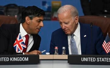 Britain's Prime Minister Rishi Sunak, left, and U.S. President Joe Biden speak at the start of the meeting of the...