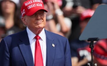 Former U.S. President and Republican presidential candidate Donald Trump looks on during his campaign event, in Racine, Wisconsin, U.S. June...