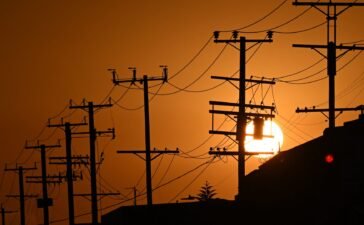 The sun sets behind power lines near homes during a heat wave in Los Angeles, Sept. 6, 2022.Patrick T. Fallon...