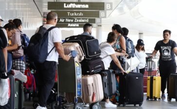 Travelers walk with their luggage outside the international terminal at Los Angeles International Airport (LAX) ahead of the July 4th...