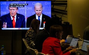 Members of the media work during the first presidential debate with US President Joe Biden and former US President Donald...