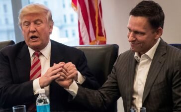 Then-president-elect Donald Trump shakes the hand of Peter Thiel during a meeting with technology executives at Trump Tower, December 14,...