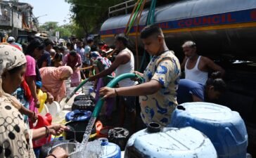 People filling water in plastic cans from a water supply tanker at Chanakyapuri, Delhi on June 12, 2024.Hindustan Times |...