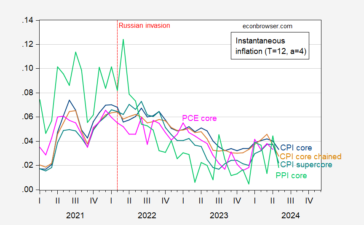Core PPI under consensus (0% vs. +0.3% m/m). Figure 1: Instantaneous inflation (T=12, a=4) per Eeckhout (2023) for core CPI (blue), chained...