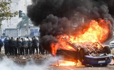 Aerial view of a fire during a protest outside the National Congress in Buenos Aires on June 12, 2024. Tomas Cuesta...