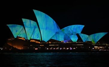 The sails of the Opera House are illuminated with projections on the opening night of Vivid Sydney 2023 in Sydney,...