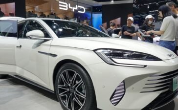 Visitors are looking at a BYD DM-i electric car at the 2024 Beijing International Automotive Exhibition in Beijing, China, on...