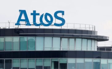 This photograph taken on April 26, 2024 shows the headquarters of the French multinational information technology company ATOS in Bezons,...
