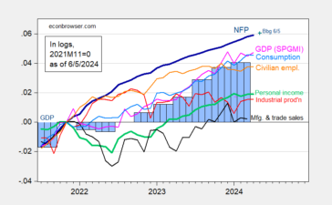 Monthly GDP recovers. Figure 1: Nonfarm Payroll (NFP) employment from CES (bold blue), civilian employment (orange), industrial production (red), personal income...