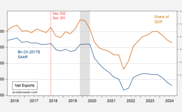 Answers: No. No. No. Figure 1: Net exports in bn.Ch.2017$ SAAR (blue, left scale), nominal as share of GDP (tan,...