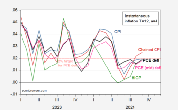 With PCE deflators released today: Figure 1: Instantaneous inflation (T=12, a=4) for CPI (blue), chained CPI (dark red), PCE deflator...