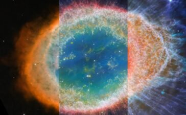 This image shows the same astronomical object, the Ring Nebula, in three different views: from Hubble (at left), from JWST’s...