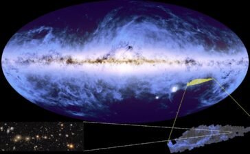 This composite map shows stars from ESA’s Gaia mission and dust from ESA’s Planck mission, together, along with the first...