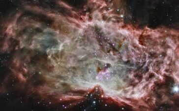The Flame Nebula, shown here in a combination of X-ray data (from Chandra) and infrared light (from Spitzer), showcases a...