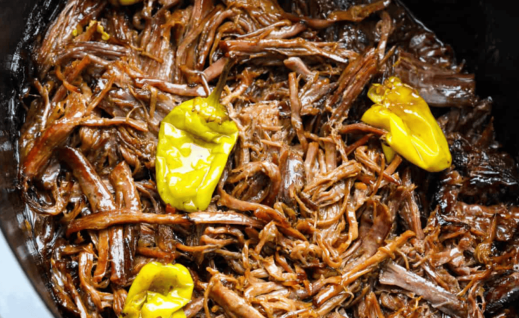 • Place 3-4 pounds chuck roast in the bottom of the slow cooker. Sprinkle 1 (1-ounce) packet ranch seasoning and 1 (1-ounce) packet au jus gravy mix on top of the roast. Top with ¼ cup butter and 8-10 pepperoncini peppers.