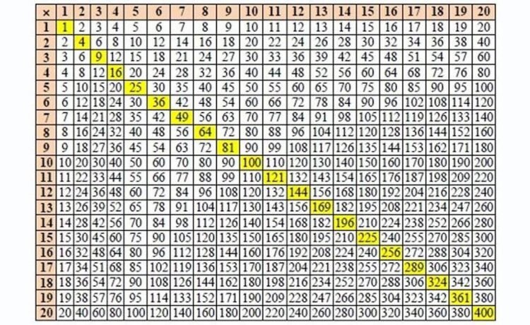This simple multiplication table shows the first 20 perfect squares along the diagonal of the table. Bizarrely enough, not only does 3² + 4² = 5², but 10² + 11² + 12² = 13² + 14². There is more to this relation than mere coincidence. (Credit: Public Domain)