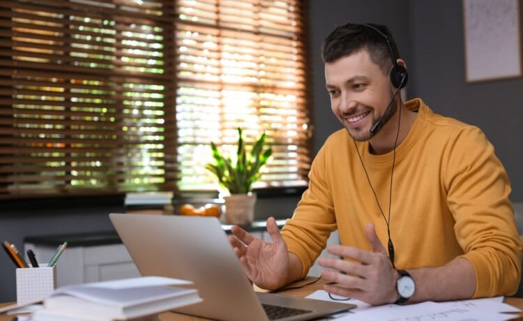 Man working from home using headset.